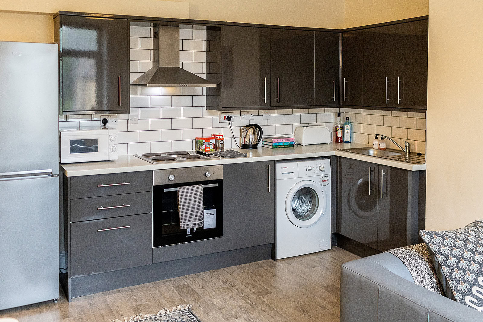 The house boasts a designer kitchen with all appliances, luxury shower room and modern furniture throughout. The house has 3 huge double bedrooms, each on its own floor. All bills (gas, electricity, water, sewerage & fibre optic broadband) are included in the rent as standard.
